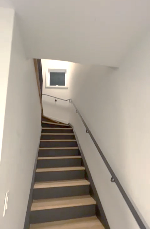 The kitchen boasts a contemporary design, complemented by a beautiful staircase.